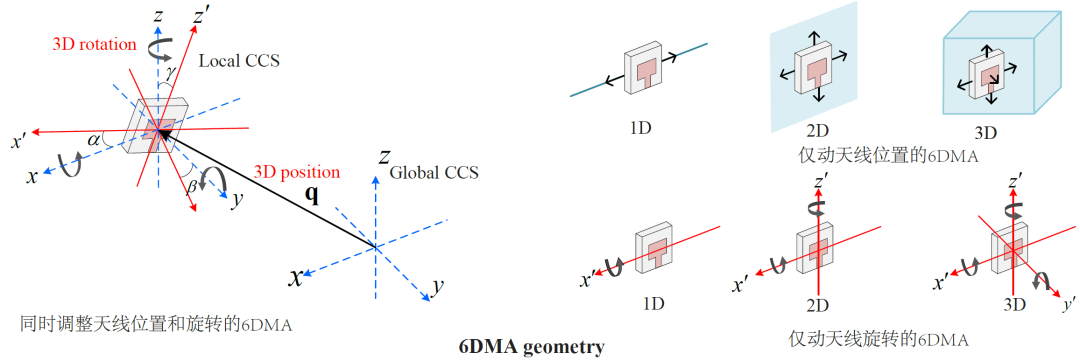为了解决上述天线系统的灵活性和适应性受限的难题,本文首次提出了六维移动天线(6DMA)。