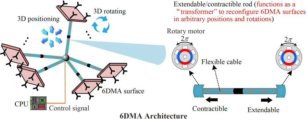 ={1,2,…,N},每个子阵列的形状各异,可以是曲面天线,也可以是平面天线。每个 6DMA子阵列均可在实际运动约束下独立调整 3D 位置和 3D 旋转。每个 6DMA 表面通过可伸缩和可旋转的杆连接到中央处理单元 (CPU),该杆内包含柔性电线,可为 6DMA提供电源并促进其与 CPU 之间的射频/控制信号交换。在杆的两端安装了两个由 CPU 控制的旋转电机,以调整连接的 6DMA的 3D 位置和 3D 旋转。此外,每个杆可以灵活收缩和伸展,以控制每个 6DMA与 CPU 之间的距离。因此,6DMA系统的功能类似于“变形金刚”,能够立即将其天线阵列重新配置为几乎任何可以想象的形状,以优化无线网络性能。具体来说,第个 6DMA 表面的位置和旋转,可以用六个参数来表征,即