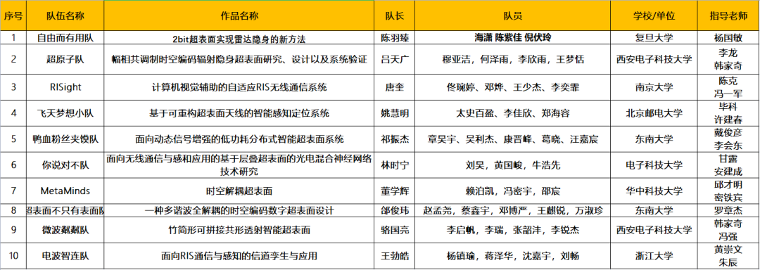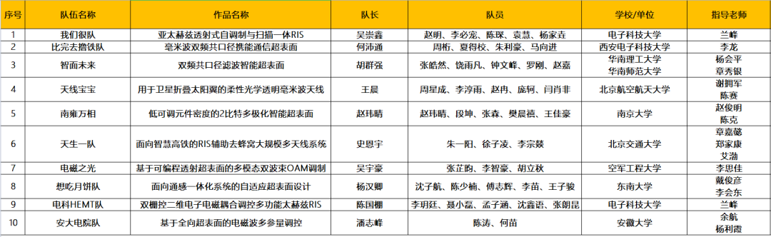 晋级“钱塘信息杯”智能超表面技术创新应用大赛决赛队伍公布如下: