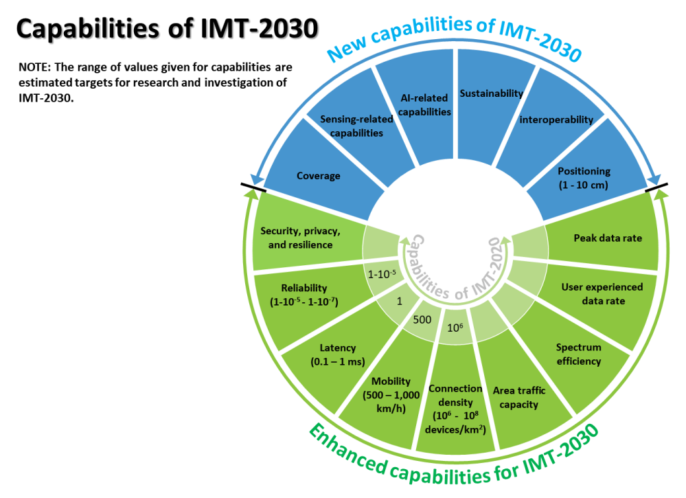 建议书定义了15个能力指标,即连接数密度、移动性、时延、可靠性、定位精度、峰值速率、用户体验速率、频谱效率、区域流量密度、感知相关指标、AI相关指标、安全隐私韧性性能指标、可持续性性能指标、覆盖、互操作。