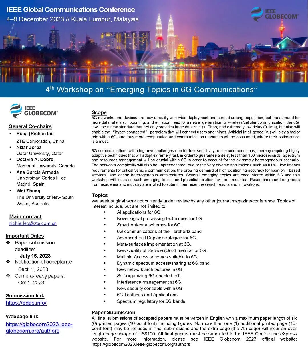 第四届”6G workshop”将在今年IEEE旗舰会议Globecom上召开。该workshop旨在为广大研究者提供交流6G未来候选技术的平台,通过主旨演讲,论文展示等环节为参会者提供充分的交流机会。得益于广大参会者的支持,去年该workshop累计吸引投稿近百篇,并有主旨演讲2个,成为当年Globecom上最大的workshop。