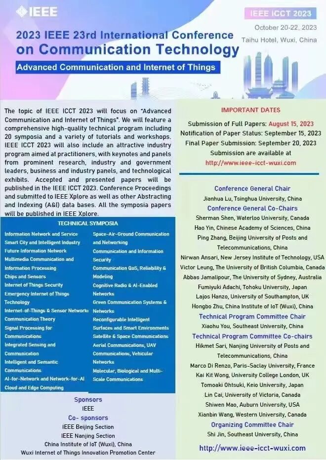 ICCT 2023将于10.20-10.22在无锡举行,欢迎大家赐稿,相聚美丽的无锡!