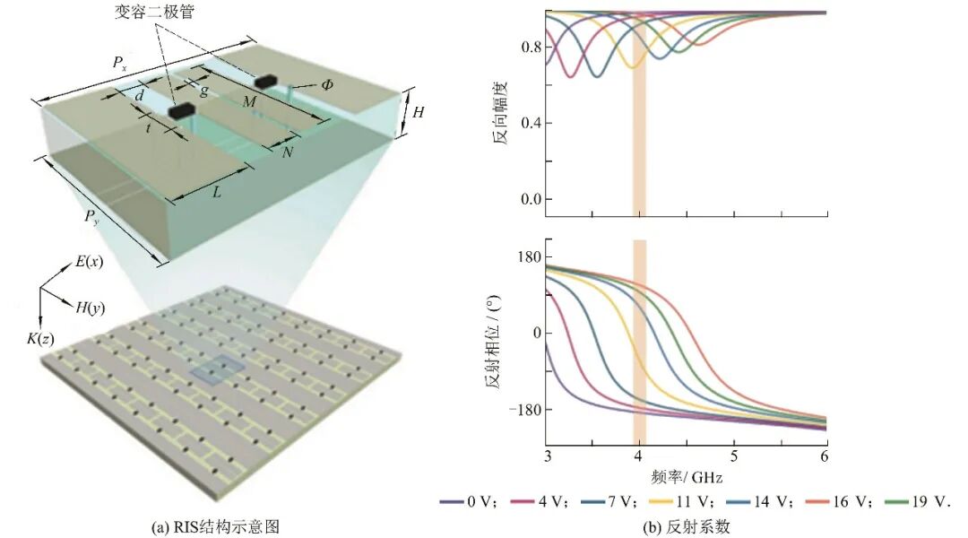 Dai等[63]设计了一种基于变容二极管的RIS单元结构,如图6(a)所示,由两对矩形贴片组成,介质板背面有一个开槽的铜接地板.每对金属贴片由变容二极管连接,二极管两端通过金属通孔与接地板连接,为其两端施加偏置电压.由图6(b)可见:当偏置电压从0到19 V不等时,相位差表现出较大的相位范围(≈300°).