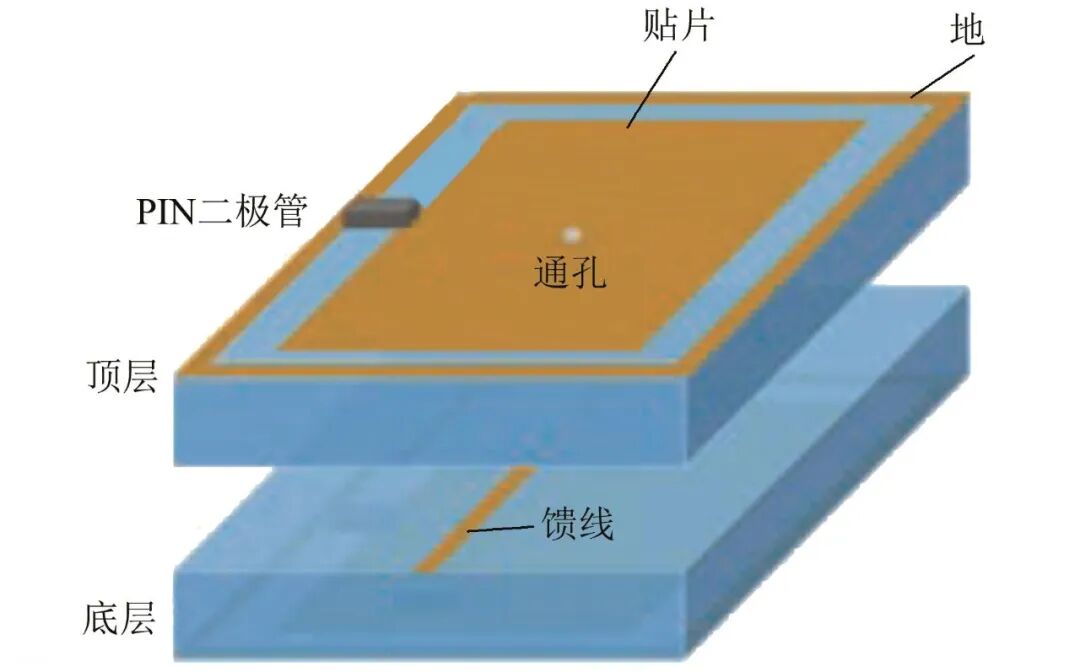 Lin等[64]提出了一种由三层金属层和两层电介质层组成的单元结构.顶部金属层的单元结构中集成了PIN二极管,中间金属层作为反射面,同时也作为整个电路的接地平面.在底部金属层中设计有扇形结构以阻隔来自直流信号的高频信号.在该单元设计中采用PIN二极管连接两个金属圆柱体,一个金属圆柱体连接到中间金属层,另一个穿透中间金属层加载直流电压,通过施加不同的电压,PIN二极管处于导通和截止,影响单元的谐振频率,从而导致相位差.单元可以实现180º的相位差和近似相等的反射振幅.