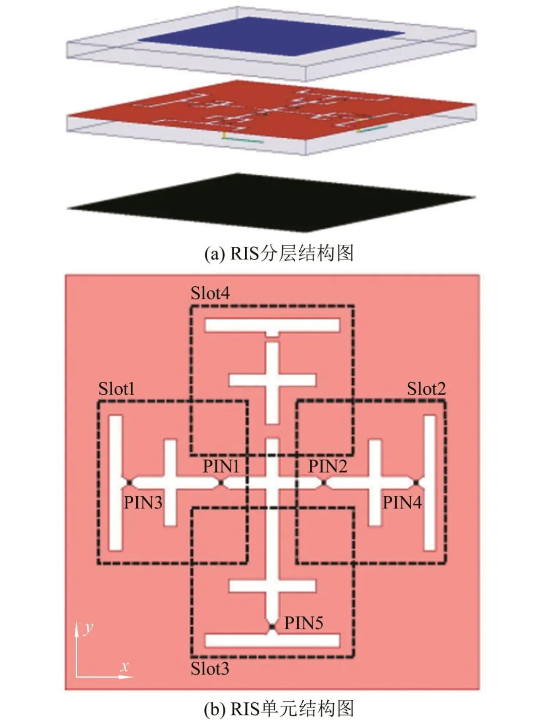 因为等效电路刻画和结构设计难度的影响,缝隙耦合式的RIS单元结构目前并不常见,其主要是通过在多层金属结构中的地刻蚀缝隙来实现可重构.