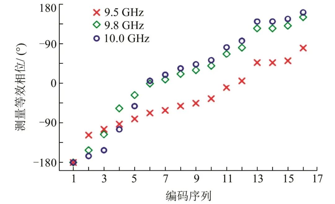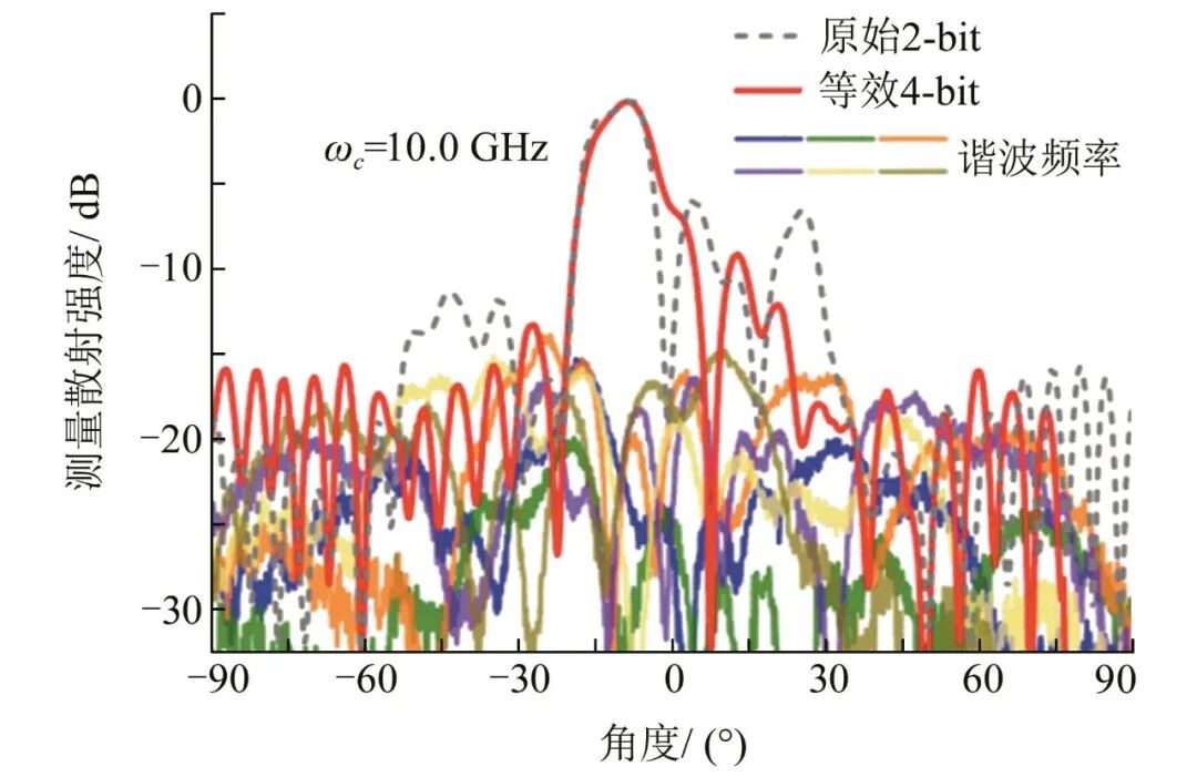 Zhang等[142]提出了一种基于2-bit时域编码RIS方法,在中心频率或谐波频率上实现多-bit甚至准连续相位调制.通过引入矢量合成方法,设计适当的2-bit时间编码序列,等效相位可以合成为具有360º相位覆盖率的任意值.此外,在波束转向应用中,采用16组时间编码序列生成等效的4-bit相位,显示出减少量化叶的优势.该文献设置了两个实验,实验一通过设定的时间编码序列,使2-bit可编程超表面(RIS)在中心频率上获得4-bit数字相位(理想的16种状态:-180º,-157.5º,-135º,-112.5º,-90º,-67.5º,-45º,-22.5º,0º,22.5º,45º,67.5º,90º,112.5º,135º和157.5º).实验二使用原始2-bit编码相位与合成等效4-bit编码相位在中心频率处分别进行波束转向,对比这两种情况下的散射模式.实验所用原型上单元由一个不规则的六角形金属片和两条印刷在接地F4B衬底上的金属条组成,厚度为1.5 mm.使用2个PIN二极管将六角形贴片与2条矩形条带连接起来,作为二极管的偏置线.当2个二极管在OFF-OFF(00),OFF-ON(01),ON-OFF(10)和ON-ON(11)4个状态之间切换时,相邻编码态之间的相位差约为90º,在9.5 GHz左右,对应的振幅均在0.79以上.实验所用原型由两个独立的样本组成,每个样本有8个列和8个连接的元素.实验一等效相位结果如图23所示,图中等效的4-bit相位仍可以覆盖中心频率为10 GHz的-180º到180º范围.由图24可见:具有等效4-bit相位的时域编码RIS在10 GHz下具有更好的波束转向性能,其旁瓣比原来的2-bit情况要低得多,图中ωc=10 GHz.此外,在谐波频率处的散射功率被很好地抑制.