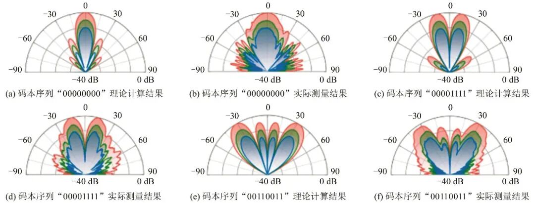 一种毫米波空时编码RIS系统[145]集成了到达方向估计和场操作的功能,能实现估计入射角和时空编码调制.文献[145]首先制作了一个工作在K波段的1-bit空时编码可编程超表面(RIS),利用3种不同的时空编码矩阵来评估其测向能力.实验表明:所设计的空时编码矩阵对入射角的估计误差小于3°.图27给出了实验中反射信号中测向谐波的频谱,表明测向的奇谐波测量结果与计算结果较为相符.此外,在所有情况下,估计的角度和值与实际值非常接近,绝对误差小于3º.结果表明:对于所有3个STC矩阵的小入射角,估计结果与实际值具有良好的一致性.但当入射角较大时,估计误差迅速增大.此外,结果表明3种时空编码矩阵的精度略有不同.