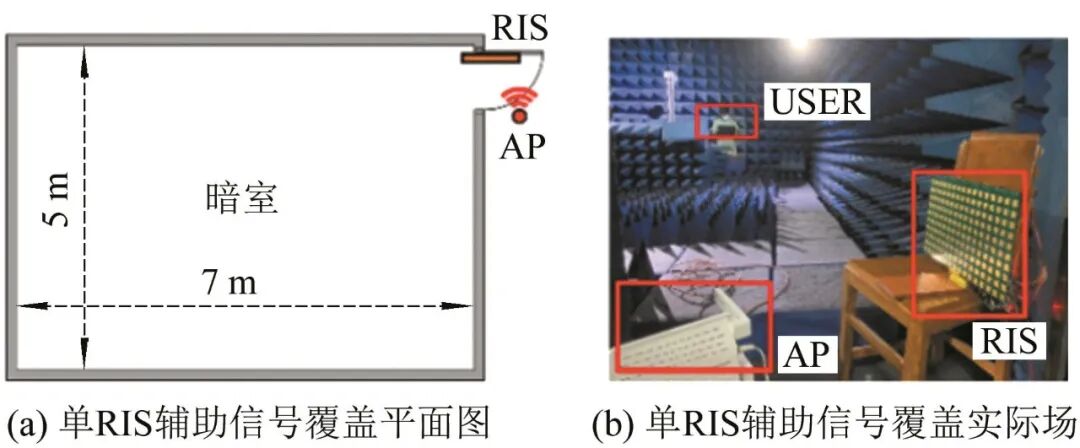 为了验证RIS原型机在无线通信系统中的有效性,研究者们往往会设计无线电覆盖增强实验,希望RIS板可以辅助无线电将覆盖范围扩展到更大的区域.另外,一些学者也进行空中下载技术(OTA,over-the-air)测试,以评估RIS板的空口性能.上述实验的评价指标通常是接收信号强度和数据传输速率.