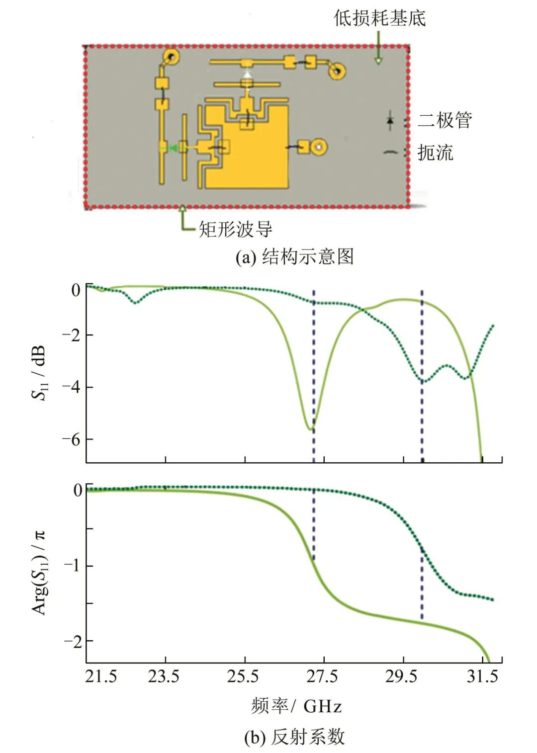 图7 双极化的单元结构及反射系数仿真[66]