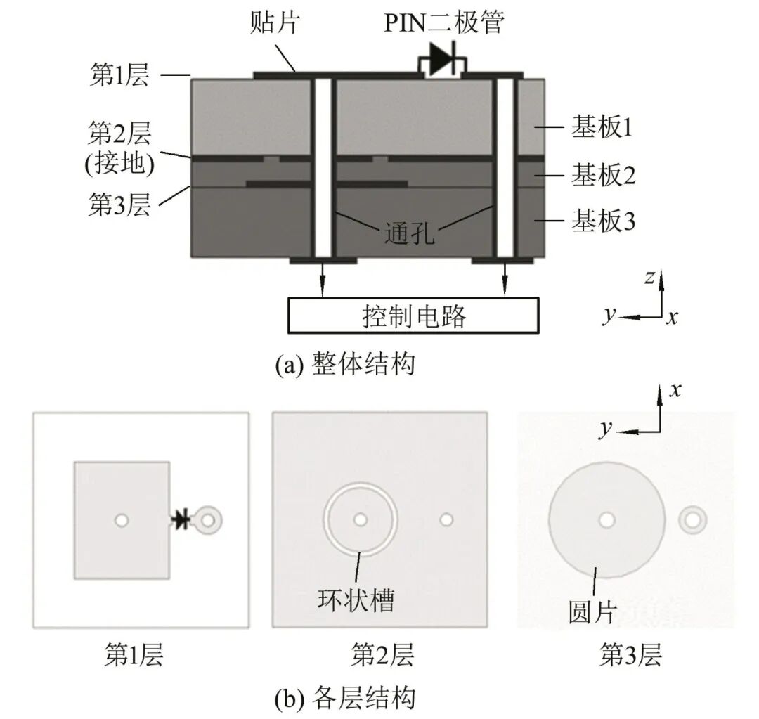 Kamoda等[56]提出使用PIN二极管实现数字相移,所提出的单元的基本模型如图4所示.一个矩形微带贴片连接到一个装有PIN二极管的短路存根上.PIN二极管起到射频开关的作用,使短路存根输入阻抗响应随着PIN二极管的开/关状态而改变.通过改变存根或贴片的尺寸使得当PIN二极管切换时,反射相位改变180º,从而实现了1-bit移相器.单元贴片的中间有通孔连接到控制电路以控制PIN二极管.接地面上的环形缝隙(第2层)和第3层的金属圆盘起到了抑制射频信号的作用.其仿真和测试的反射系数表明,对于60.25 GHz的入射电磁波,经过PIN二极管开关两种状态的单元反射之后,相位差近似为180º,仿真和测试略有差别主要是由于工程制作的误差.该团队最终制作了一个160×160,一共2.56×104个单元的阵列,验证了天线的重构能力,不同波束方向和天线增益下的实测辐射图与计算结果较为相符.