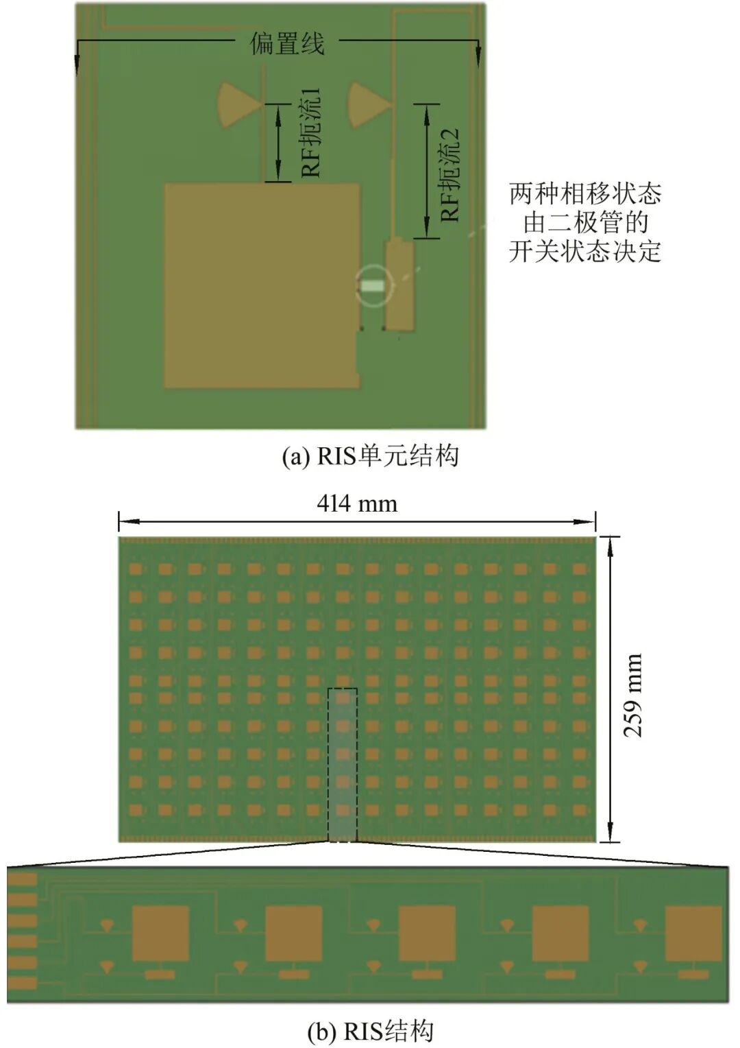 Pei等[65]提出的RIS单元与文献[56]类似,通过改变单元尺寸将RIS单元的工作频率移到了5.8 GHz.
