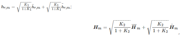 式中:K1和K2分别为两段信道的Rician因子;hr,m,H¯m表示LOS部分的信道矩阵;h˜r,m,H˜m表示非直射链路部分的信道矩阵.多径分量部分一般假设为窄带高斯过程,服从复高斯分布CN(μ,σ2).