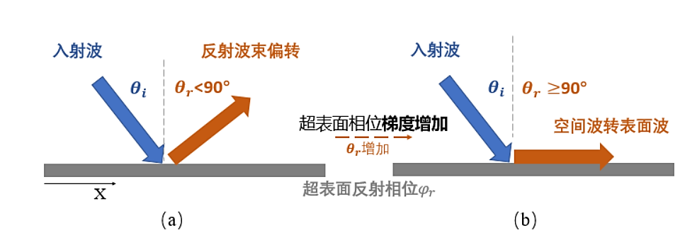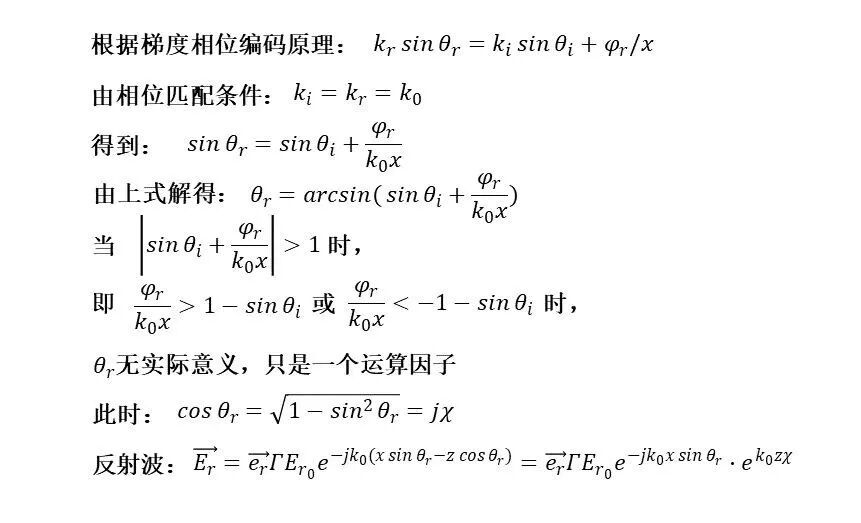 进行对反射相位进行编码时,如果反射角小于90度,则反射波为一个实现了波束偏转的空间波。而当反射角等于或大于90度时,反射波不再指向上半平面,而是形成表面波。具体推导过程如下: