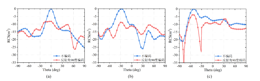 从仿真结果上可以看出,通过在阵面上进行编码后,超表面的反射RCS与未编码时相比,能够在整个反射平面均实现明显缩减,其中最大值可达到10 dB。由此可见所提出的 2-bit 超表面具有良好的 RCS 降低功能。