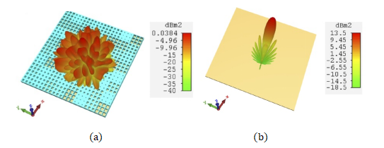 图1 多比特超表面实现RCS缩减:(a)随机编码多比特超表面在正入射时的远场方向图。(b)相同尺寸PEC在正入射时的远场方向图。