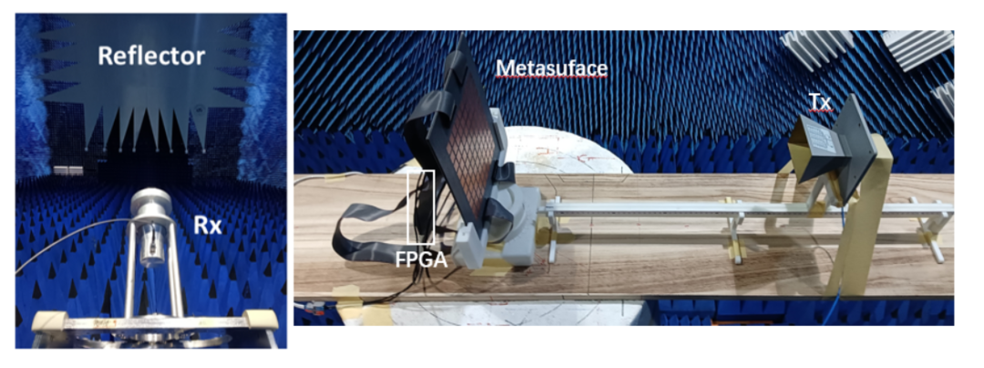 超表面的测试在紧缩场暗室中进行,测试设备包含一对用于发射与接收的喇叭天线、FPGA波控板和矢量网络分析仪。通过旋转超表面底座转台的角度改变入射波的入射角。测试结果如图所示,测试结果与仿真结果比较符合。
