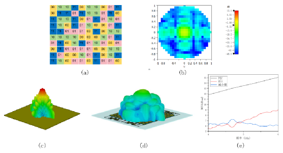 图8 (a)随机编码模式及(b)正入射时超表面使用随机编码仿真得到的2D远场图。(c)相同尺寸PEC仿真得到的远场方向图。(d)正入射时超表面使用随机编码仿真得到的远场方向图。(e)正入射时可重构反射超表面与PEC在theta=0°处的RCS仿真结果比较。