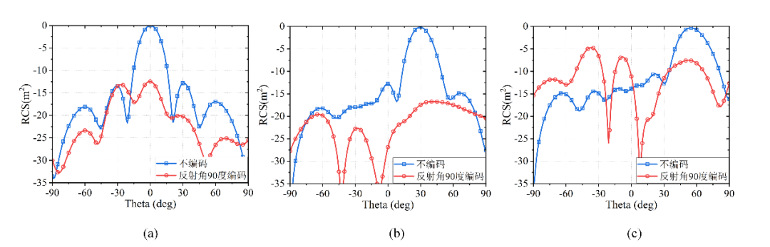 图5 不同入射角下的反射RCS的仿真结果:(a)入射角0°。(b) 入射角-30°。(c)入射角-60°。