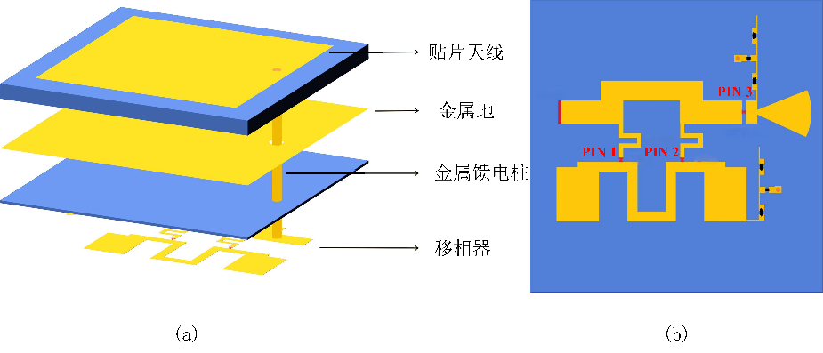 2-bit可重构超表面单元的几何结构如图2所示。图2(a)显示了超表面单元的结构图,单元由三层金属和两层介质组成。两层介质均为F4b