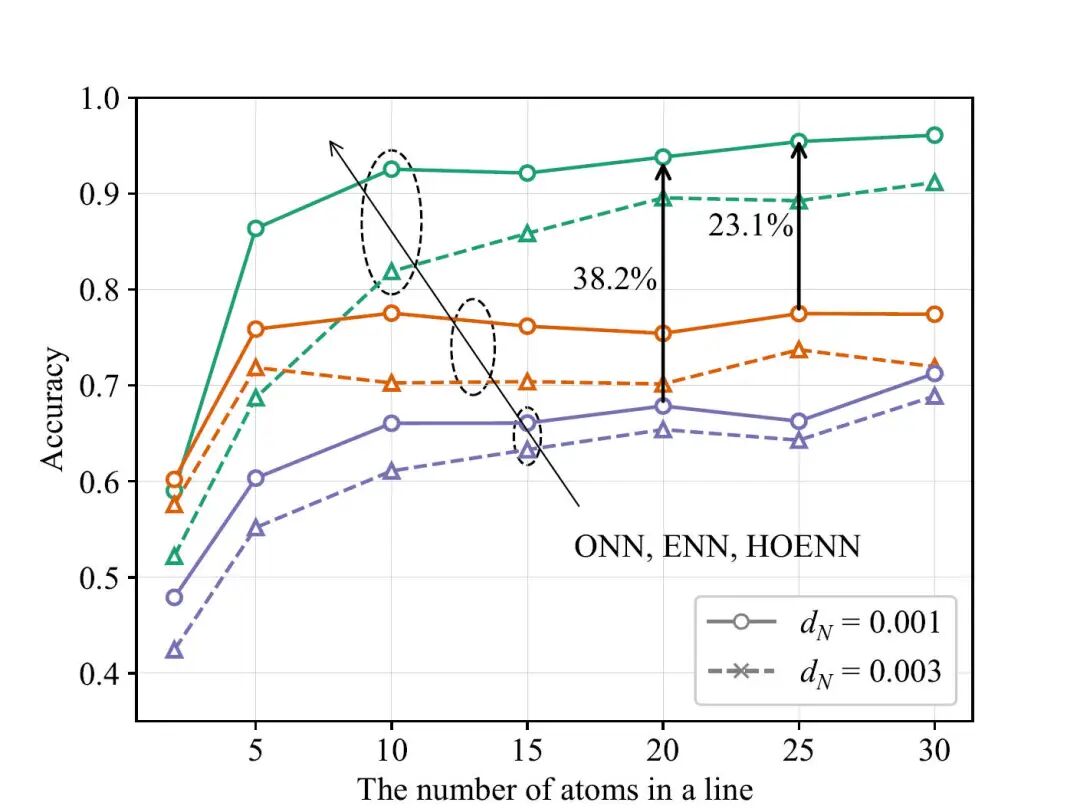 图3 不同超原子间距下语义识别准确率随着光网络每行超原子数量变化趋势图
