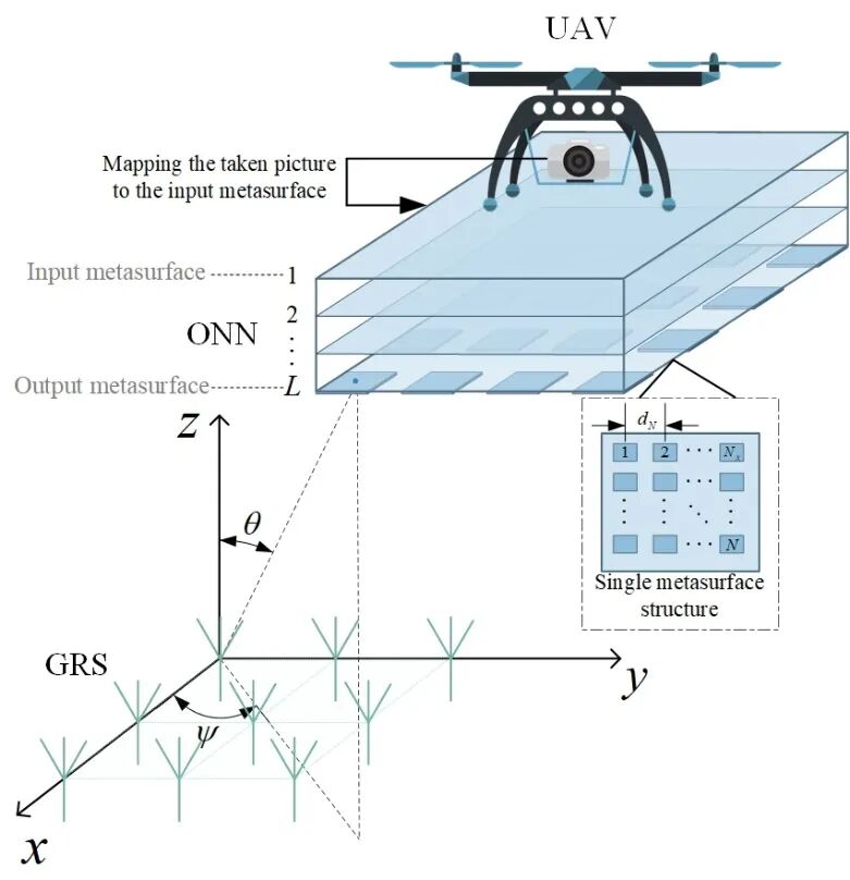 如图2,本文提出了一种语义通信系统,利用无人机和层叠超表面进行灾害识别。无人机通过摄像头拍照,并将图片编码为第一层超表面的复透射系数。之后,ONN提取语义信息并传输到地面接收站,接收站通过ENN解码和恢复语义信号,判别灾害情况。地面接收站使用接收天线的接收功率作为语义信息,可以表示为: