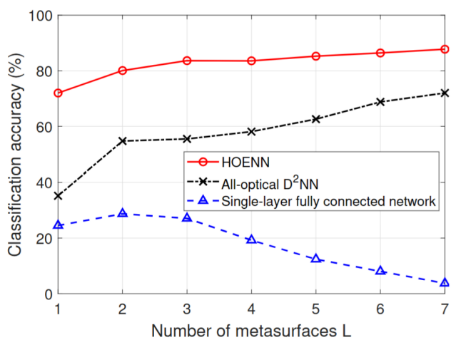 为超表面之间的层间传播系数矩阵。由于整个计算过程在电磁波的传播过程中自然完成,因此该结构能低功耗地以光速进行并行计算。