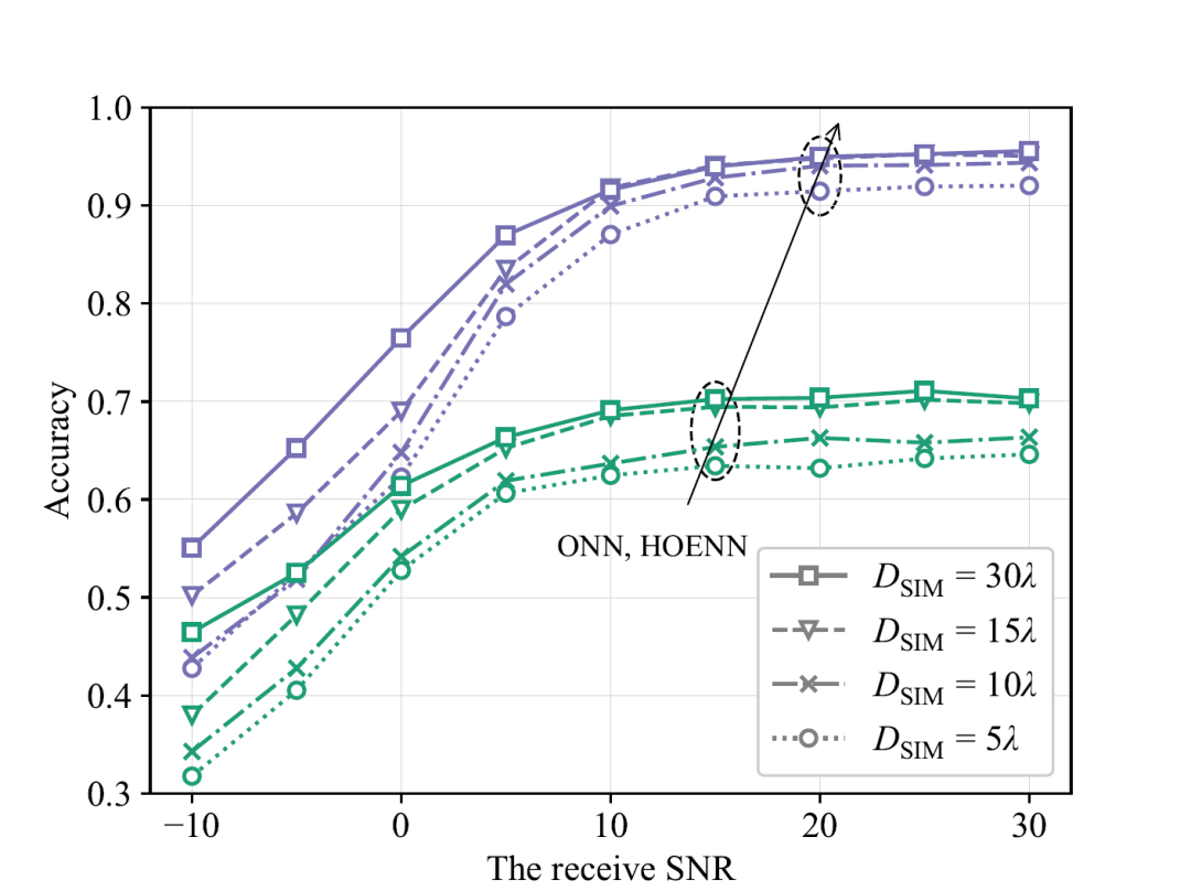 深度学习因其强大的非线性建模能力与适应能力等优点,被广泛引入无线通信的多个领域,如波束形成,信道估计,语义通信等。一般来说,深度学习依赖于神经网络来实现,而大规模的神经网络难以被部署在功耗与硬件条件受限的嵌入式设备上,限制其使用范围。有鉴于此,我们尝试构建一种基于层叠超表面(SIM)的光电混合神经网络(HOENN)架构,并以语义通信与DOA估计两个场景为例,将其用于无线通信与感知领域之中。在我们设计的架构中,基于SIM的光学神经网络(ONN)能够直接在波域中提取电磁波的低维空间分布特征并传递给传统电子神经网络(ENN),以减小整个系统的计算负载。