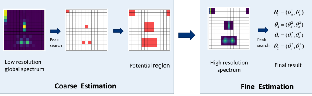 另一方面,我们采用了一种分步DOA估计方法。该方法主要分为粗估计与精估计两个阶段,在粗估计中,通过低分辨率角谱缩小预选范围;在精估计中,在预选范围内生成高分辨率角谱以获得最终结果。