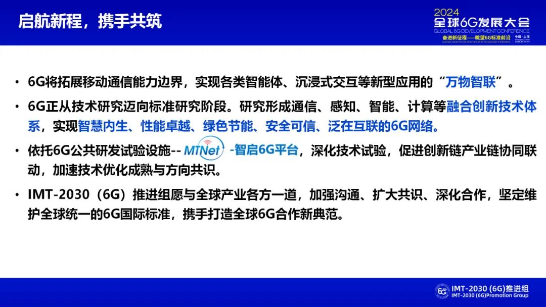 2024年11月13-14日,由中国IMT-2030(6G)推进组、中国通信学会、中国信息通信研究院联合主办的2024全球6G发展大会在上海松江区成功举办。在11月13日主论坛“全球6G进展”主题环节中,中国信息通信研究院副院长王志勤发表了《我国6G研究进展 — 构建万物智联的技术体系》主题演讲,分享IMT-2030(6G)推进组的工作进展情况,详细内容请见下文。