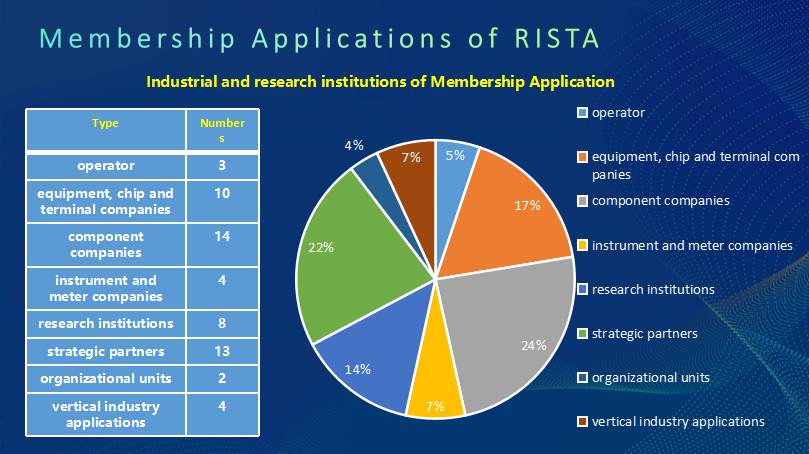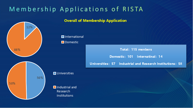 Up to now, RISTA has received membership applications from 115 domestic and international units, 101 domestic units, and 14 overseas units. There are 57 universities (47 mainland universities, 3 Hong Kong and Macao universities, and 7 overseas universities), 58 industrial and research institutions (3 operators, 10 equipment, chip and terminal companies, 14 component companies, and 4 instrument and meter companies, 8 research institutions, 13 strategic partners, 2 organizational units, and 4 vertical industry applications company).