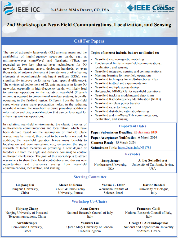 IEEE ICC 2024 会议6G近场通信、定位和感知workshop征稿,欢迎踊跃投稿~