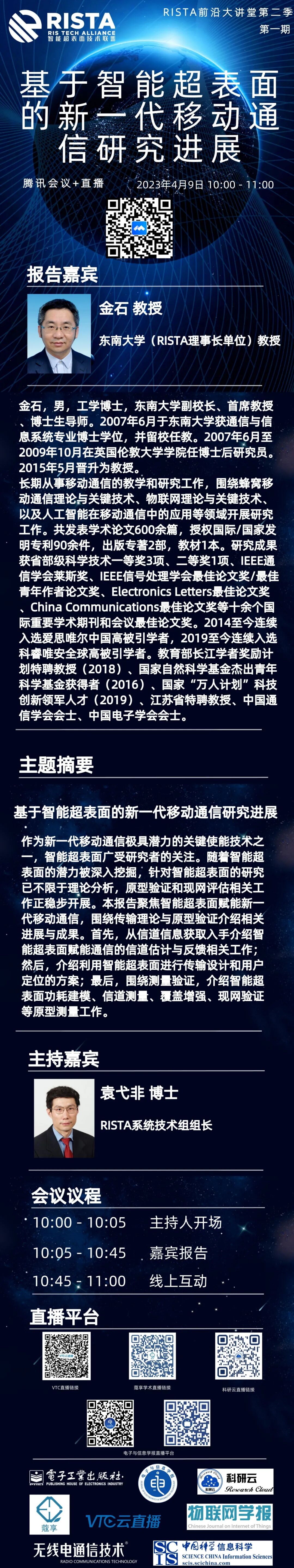 RISTA前沿大讲堂第二季第一期| 东南大学金石教授作“基于智能超表面的新一代移动通信研究进展”的报告