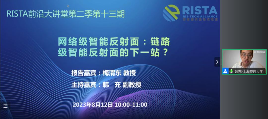 2023年8月12日智能超表面技术联盟主办的RISTA前沿大讲堂第二季第十三期线上研讨讲座在上海交通大学(智能超表面技术联盟成员单位)韩充副教授的主持下圆满结束。