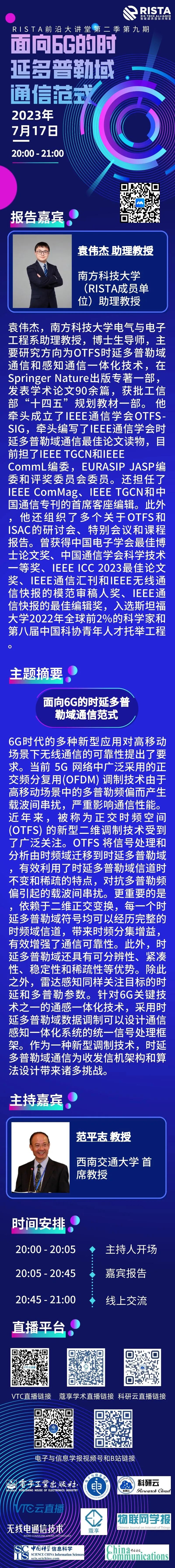 | 2023.7.30 10:00 – 11:00 | 张建华 | 面向6G的信道测量、建模与仿真研究进展 |