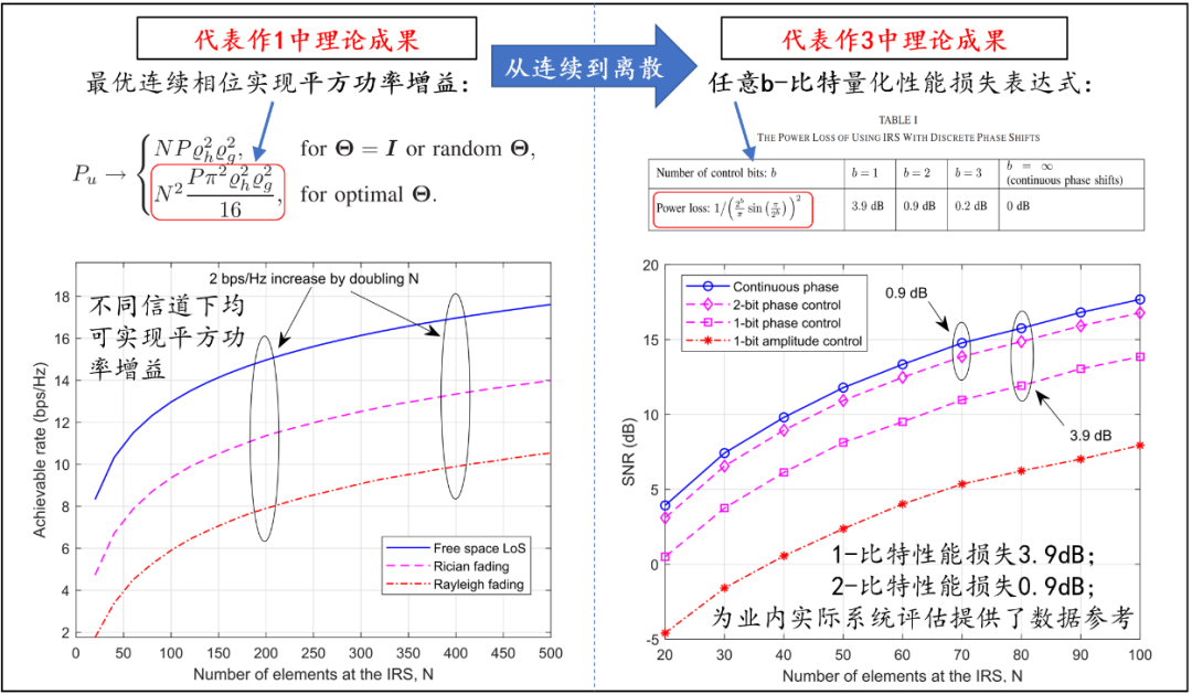 团队证明了基于连续相移的智能反射面能够以渐近平方(N2)的形式提高接收机功率,奠定了使用智能反射面显著提升无线通信性能的理论基础(如图1所示)。为进一步降低系统成本和设计复杂度,采用低精度离散相移反射单元,证明其同样可实现上述渐进平方功率增益,同时还推导出任意精度智能反射面性能损失的闭式表达式。其中,1-比特和2-比特量化损失约为3.9dB和0.9dB,其揭示了在实际中使用2-比特单元足以接近极限性能增益,论证了通过增大反射面口径弥补低精度单元性能损失的有效性。该成果为大规模部署低成本智能反射面实现热点覆盖提供了理论依据,也为业界评估实际系统中智能反射面的性能提供了参考数据[1,3]。