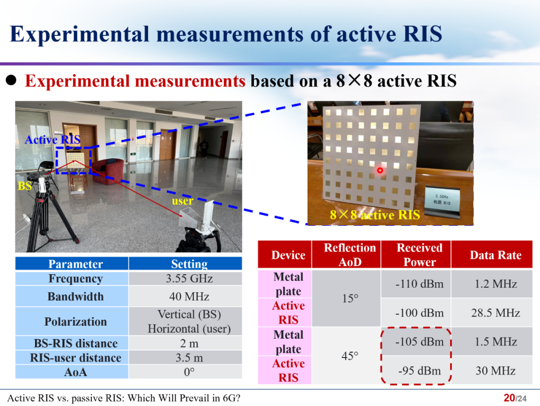 同时,由于有源RIS引入了有源器件,其引入的噪声不再像无源RIS一样可以忽略不计,故研究团队还构建了有源RIS的新信号模型,并研制了一个工作于现有5G主流频段3.5 GHz的64单元有源RIS,通过实测数据对信号模型进行回归分析和验证。